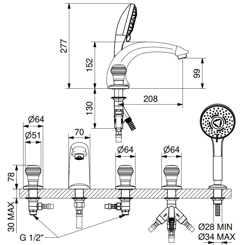IB RUBINETTERIE ONLYONE ARBEITSPLATTE 5-LOCH-BADEWANNENRAND MIT CHROM-BRAUSEGARN