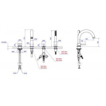 • QUADRO DESIGN VOLCANO 4-LOCH-BADEWANNENRANDBATTERIE MIT BRAUSEGARNITUR