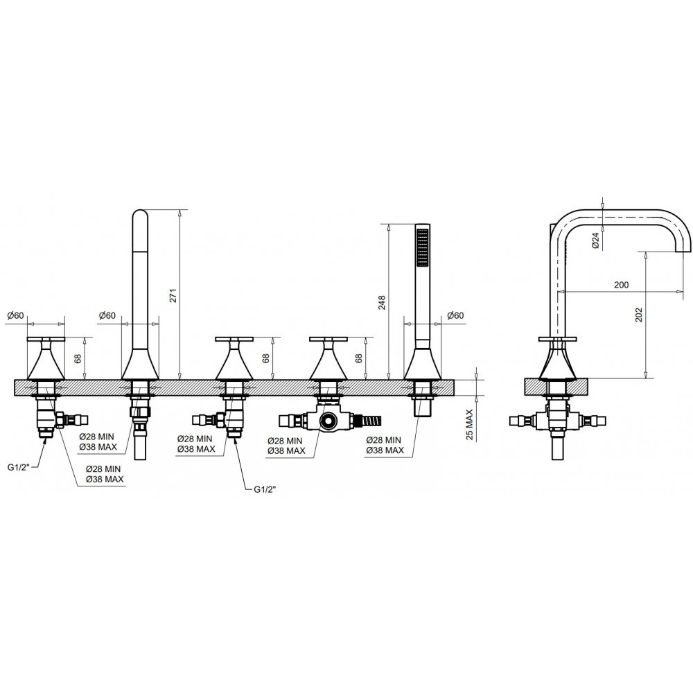 • GABOLI FRATELLI SIMPLY BADEWANNENRANDMISCHER 4 LOCH MIT AUSGUSS UND KIT DUSCHE