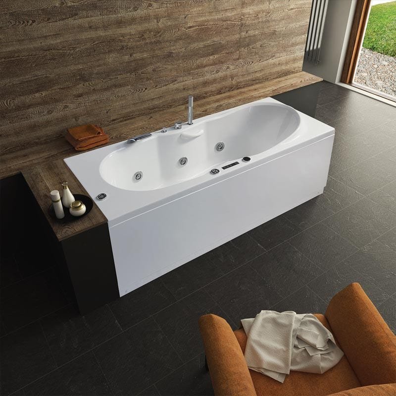 Rechteckige Acryl-Badewanne mit Rahmen und Paneelen ohne Hydromassage.