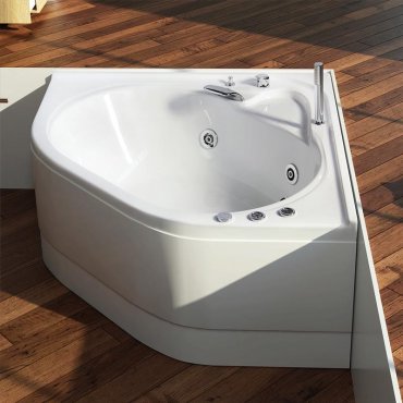 Eckbadewanne aus Acryl mit Rahmen und Frontplatte mit Hydromassage.