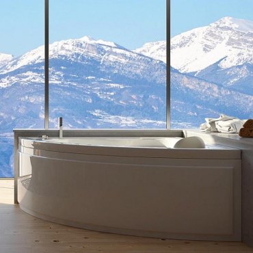 Eckbadewanne aus Acryl mit Rahmen und Frontplatte mit Hydromassage.