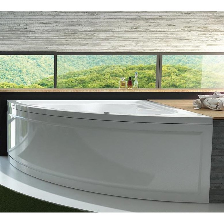 Eckbadewanne aus Acryl mit Rahmen und Frontplatte mit Hydromassage.