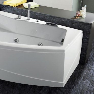 Asymmetrische Acryl-Badewanne mit Rahmen und Frontplatte mit Hydromassage.