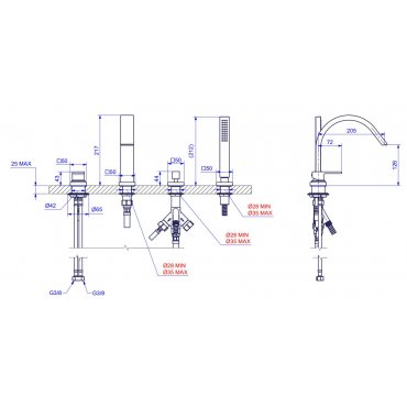 QUADRO DESIGN OTTAVO 3-LOCH-BADEWANNENRANDBATTERIE MIT BRAUSEGARNITUR