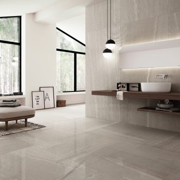 Das Größenspektrum dieses Porzellan-Steinzeugs umfasst auch große 120X120- und 120X240-Platten, letztere mit einer Dicke von nur 6 mm.