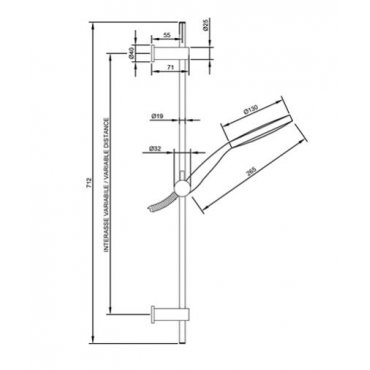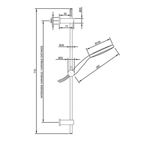 Minimale runde Messing-Gleitschiene, bestehend aus: Rampe komplett aus Messing mit verstellbaren Wandhalterungen Wassersparende, kalkabweisende Abs-Handbrause Ø 130 mm Flexibler Schlauch cm 150 mit Verdrehsicherung.