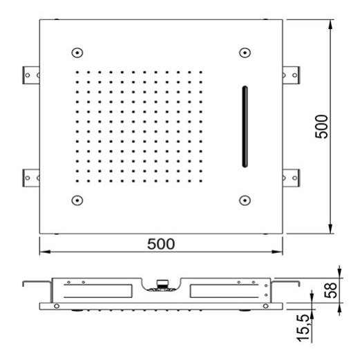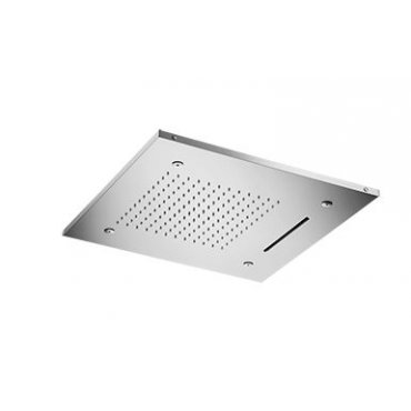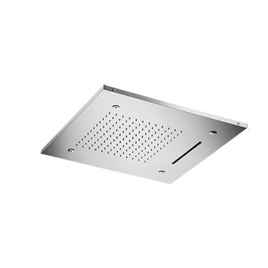 Quadratische Kopfbrause aus Edelstahl, Antikalk-System, mit 3 Strahlen: Regen, Wasserfall und Vernebler, Maße 500 x 500 mm, mit Befestigungssatz für Deckenmontage.