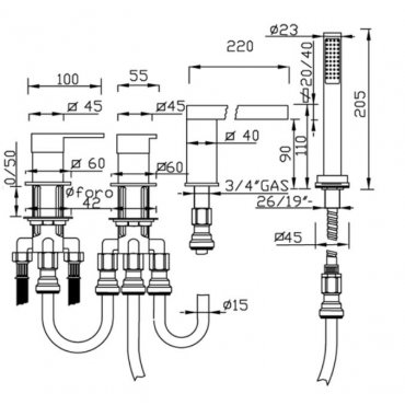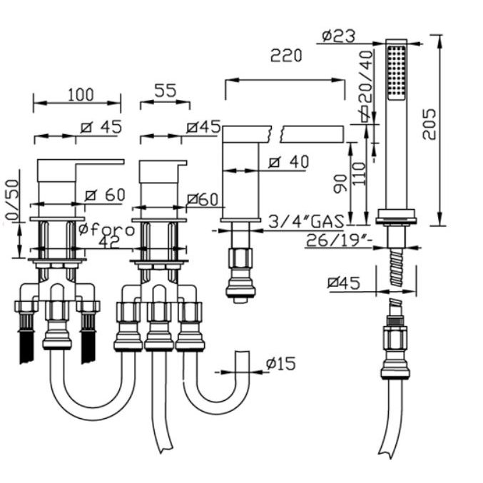 GABOLI FRATELLI NEW SPACE BADEWANNENRANDMISCHER 4 LOCH MIT KIT DUSCHE