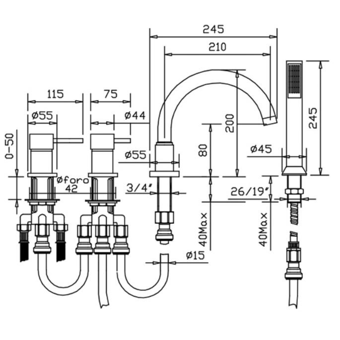 GABOLI FRATELLI GRILLO BADEWANNENRANDMISCHER 4 LOCH MIT AUSGUSS UND KIT DUSCHE