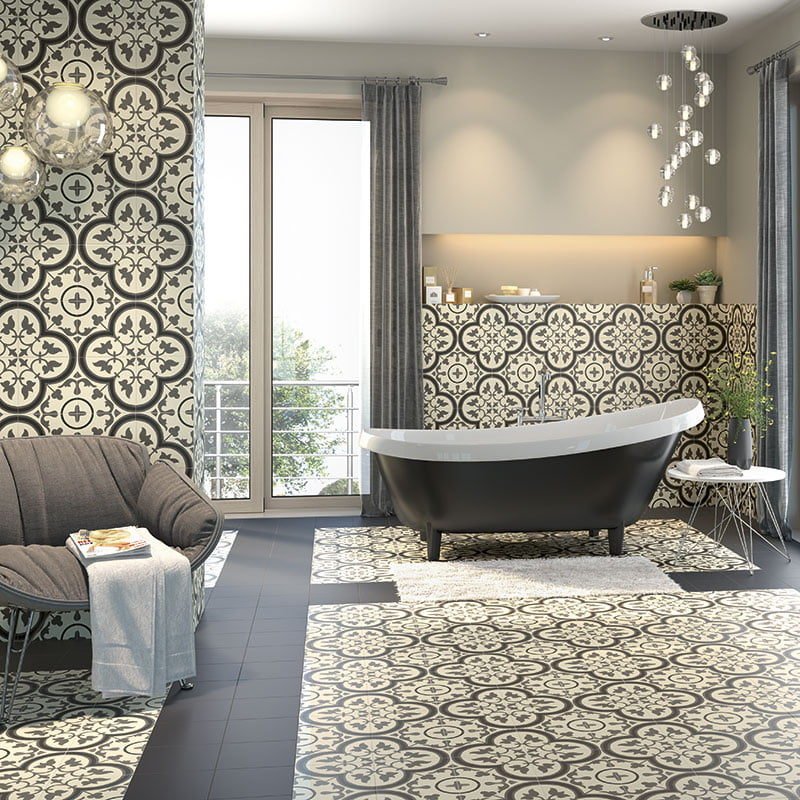 Drei Einflüsse, die in dieser Sammlung wiedergegeben werden The three capitals von Mainzu. Die Oberfläche ist seidenmatt, halbglänzend, ideal sowohl für Wand- als auch für Bodenbeläge.