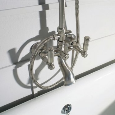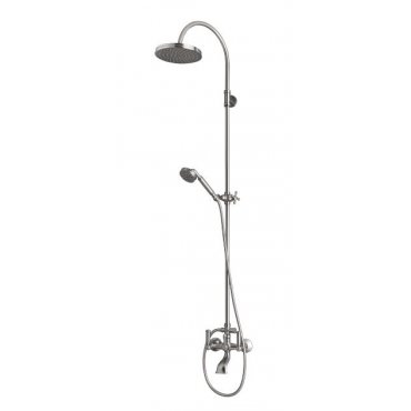 Duschset bestehend aus: Duschsäule aus Messing Ø 20 mm mit Umsteller 1/2”M x 3/4”M x 3/4”F - Kopfbrause Liberty-Gom Ø 210 mm – Liberty-Gom Handbrause mit schwenkbarem Brausehalter - Doppelwicklung Brauseschlauch A03045 cm 150 1/2“ FF. Badewannenbatterie mit Umsteller. Einsetzung: Badewanne.
