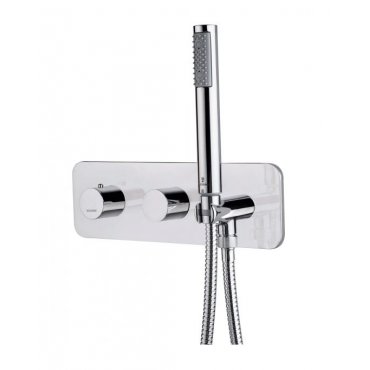 Duschset bestehend aus Hochdurchfluss Thermostat-Mischbatterie mit 2-Wege Umsteller und Brausehalter mit Wandanschlussbogen, ¾” Anschlüsse, Handbrause ZEN mit Schlauch.