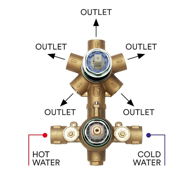Z00125: Unterputzkörper für universale Thermostat-Brausebatterie mit 2-5 Wasserausgänge. 2-5 Wasserausgänge Umsteller und 1/2"iG Verbindungen. 2/3/4/5-Wasserausgänge Einstellungsset (Einstellungsnocken und Verschlüsse).