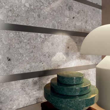Ein Material, das als ebenso futuristisch gilt wie die schlichte Eleganz des Ceppo di Gré, ein Sedimentgestein, das aus dem Iseosee gewonnen wird und sich durch unterschiedliche und einzigartige Kieselsteine auszeichnet. Futura von Ariana ist das farbige Feinsteinzeug mit drei verschiedenen Oberflächen: naturbelassen "silk touch", lappato und gehämmert.