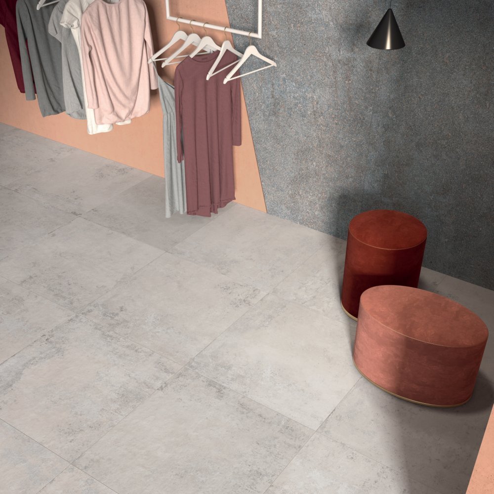 Die Ghost-Kollektion ist ein Porzellan-Steinzeug mit Stuckeffekt,
