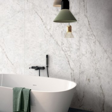 Sensi Gems, ABKs Porzellan-Steinzeugkollektion, die von der Eleganz des Marmors inspiriert ist, wird auf natürliche, weiche und luxuriöse Oberflächen in den Größen 160x320, 120x120, 60x120, 120x278 und in den Farben Crystal, Iceberg, Taj Mahal und Titanium Black aufgetragen.
