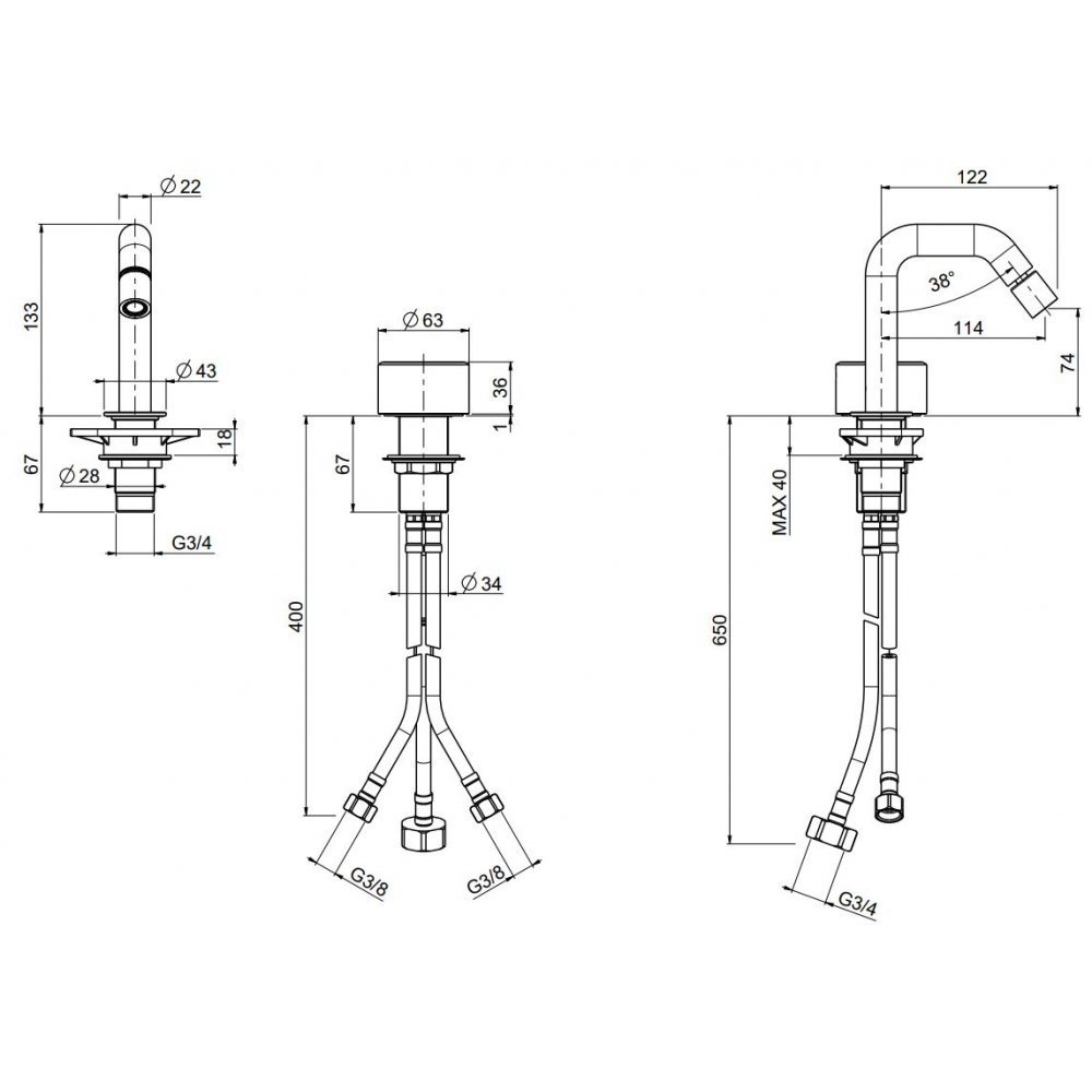 QUADRO DESIGN STEREO 2-LOCH-BIDETBATTERIE H 133 MM