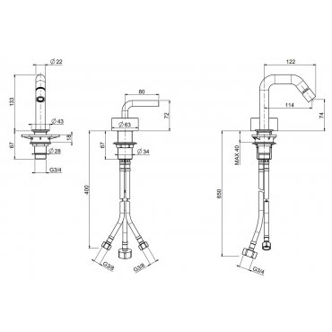 2-Loch-Hydrodruckbatterie mit schwenkbarem Auslauf für Bidet H.133 mm.