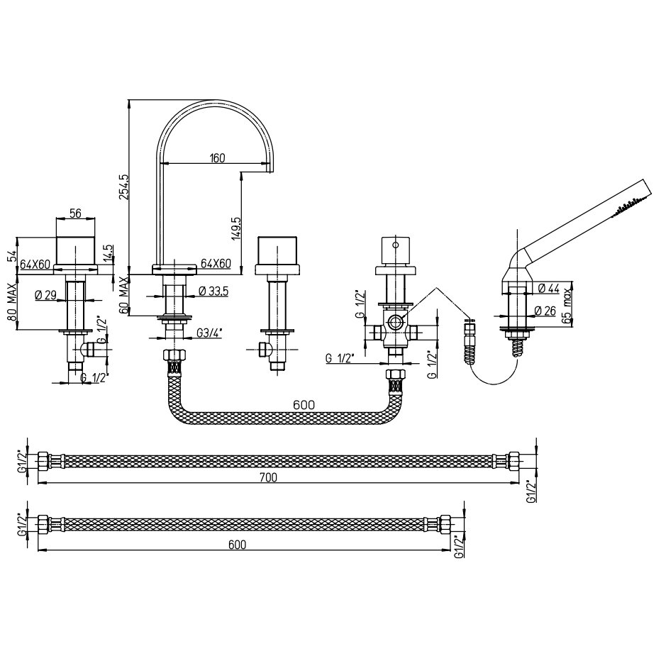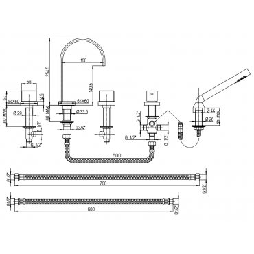 GABOLI FRATELLI YUPPI 4-LOCH-WANNENBATTERIE MIT BRAUSEGARNITUR UND UMSTELLER