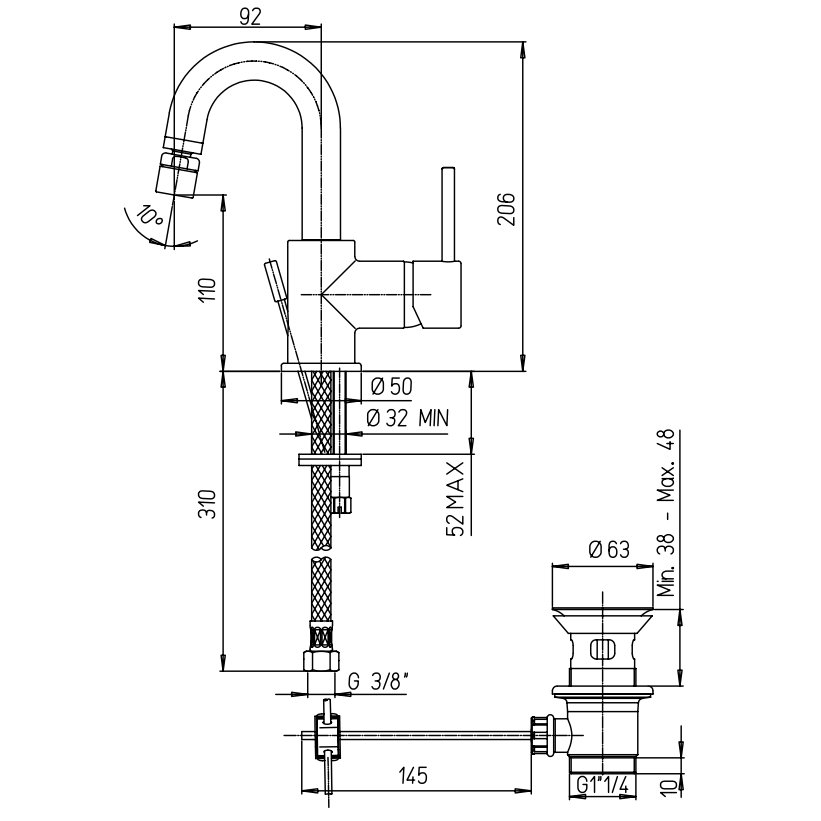IB RUBINETTERIE MARMO BIDET-EINLOCHBATTERIE KOMPLETT MIT ABLAUFGARNITUR