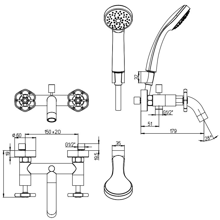 IB RUBINETTERIE HERMES WANDMONTIERTE WANNENGRUPPE MIT DUSCHSET