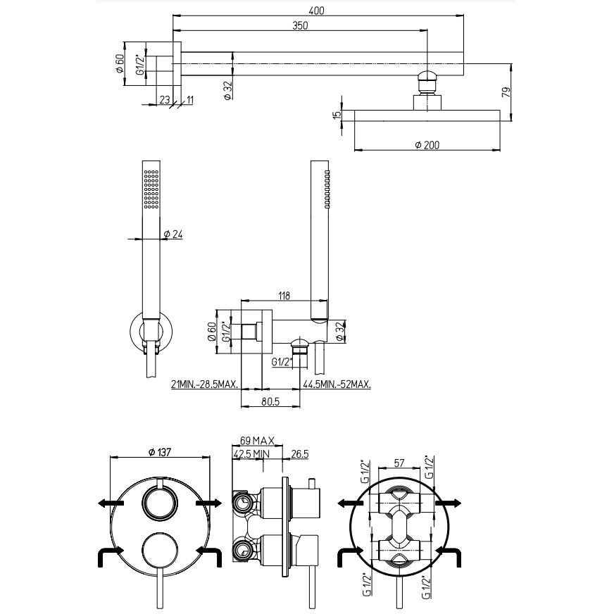 PAINI UP-ARMATUR MIT KOPFBRAUSE AUS ABS, BRAUSEARM UND BRAUSEGARNITUR