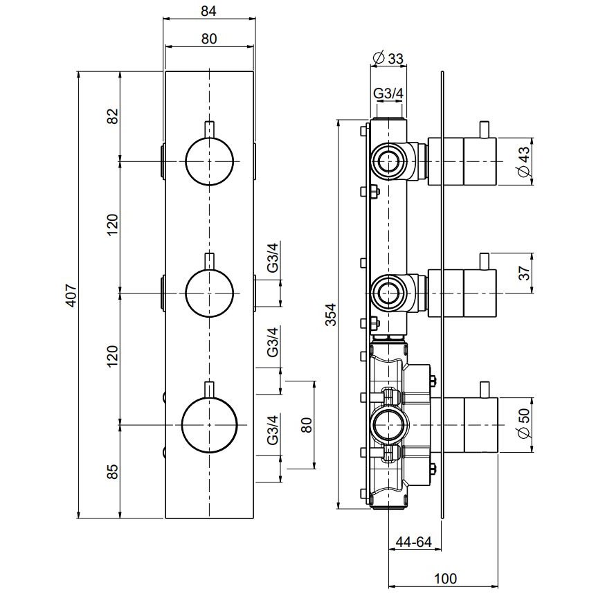 Thermostatische Mischbatterie 3/4 mit 2 Absperrventilen.