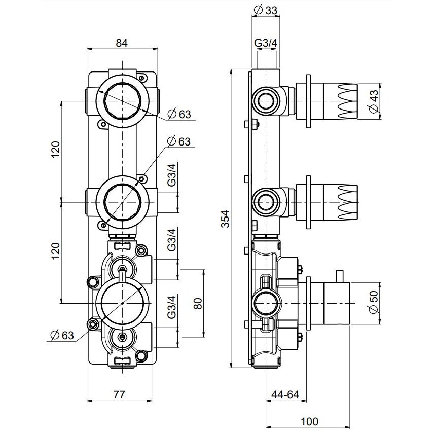 Thermostatische Mischeinheit 3/4 mit 2 Absperrventilen.