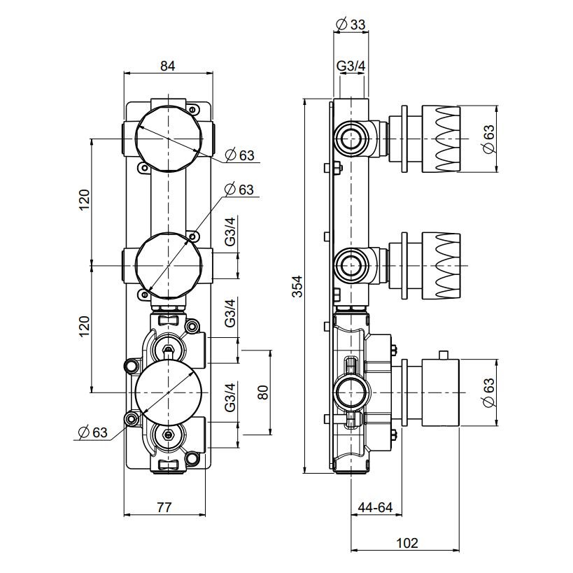 Thermostatische Mischeinheit 3/4 mit 2 Absperrventilen.