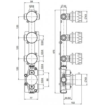Thermostatische Mischeinheit 3/4 mit 3 Absperrventilen.