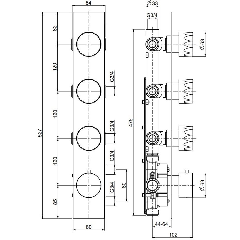 Thermostatische Mischeinheit 3/4 mit 3 Absperrventilen.