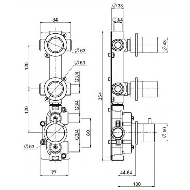 Thermostatische Mischeinheit 3/4 mit 2 Absperrventilen.