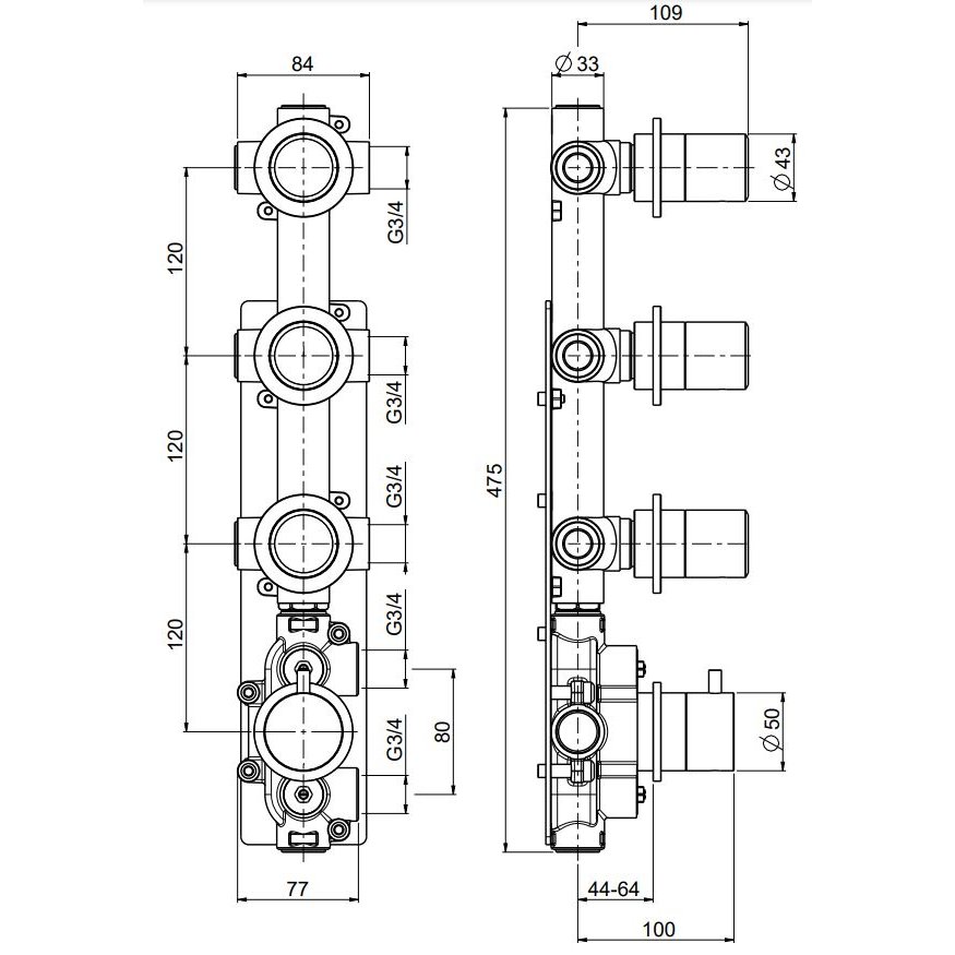 • BOSSINI OKI THERMOSTAT-MISCHBATTERIE 3 EINZELPLATTEN FÜR AUFPUTZ MIT 4 AUSGANGE