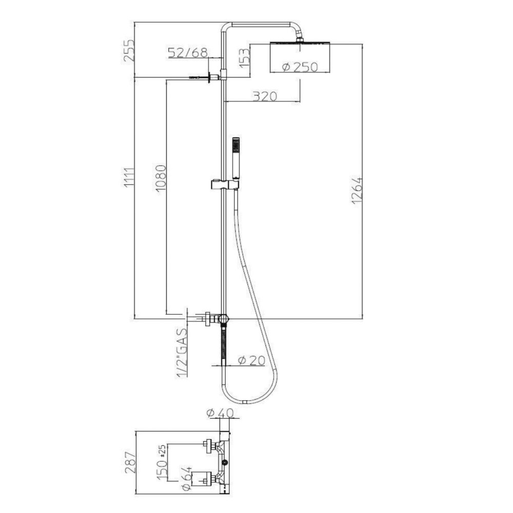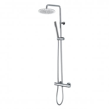Wandsäule aus Messingprofil D. 20 mm. Tetis Duschkopf Ø 250 mm. Handbrause aus Messing. Doppelwicklung Messing-Flexschlauch 150 cm Externer thermostatmischer.