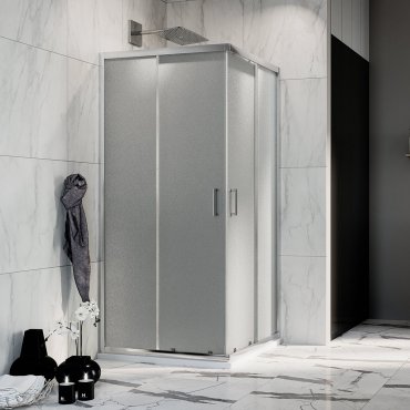 Quadratische Eckduschabtrennung mit 2 Schiebetüren und 6 mm bedrucktem Glas.