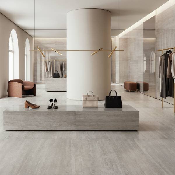 Die nuancierten und nie übertriebenen Farbnuancen erzeugen einen einzigartigen Steineffekt. Prestigio Travertino ist ein Feinsteinzeug, das ein Gefühl von Wesentlichkeit und Raffinesse vermittelt und dank seiner beiden Oberflächen - poliert und weich - jedem Raum eine moderne und raffinierte Atmosphäre verleiht.
