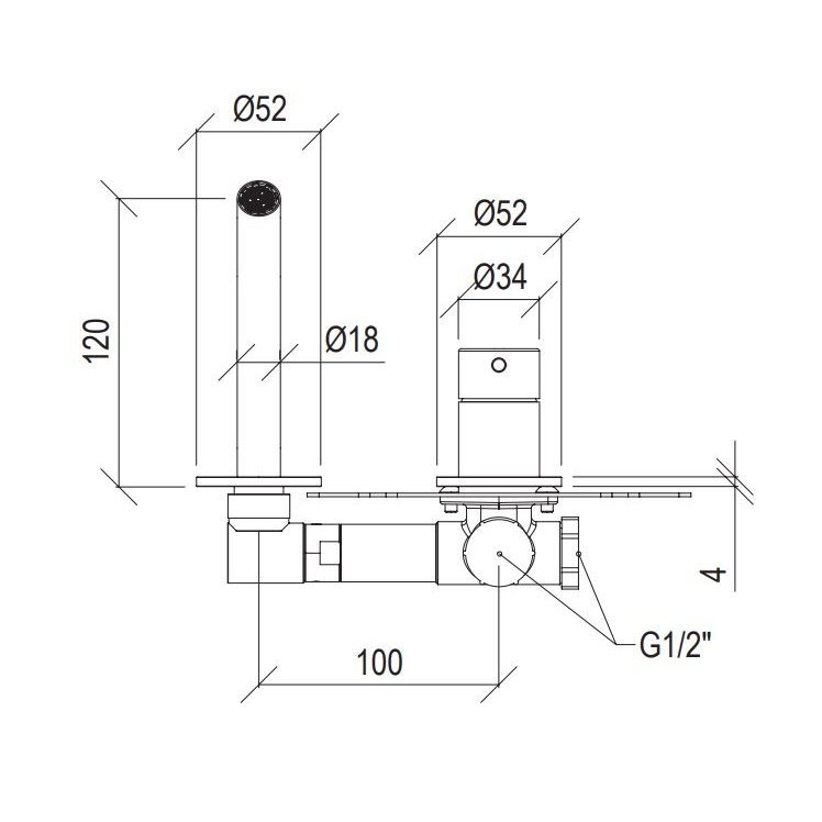 Unterputz-Waschtischbatterie, 34 mm Durchmesser, aus Edelstahl 316L, mit 12 cm langem Auslauf, Luftsprudler M16,5x1 und Anschluss G1/2".