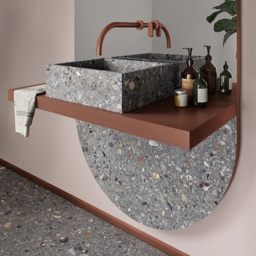 Die Feinsteinzeugkollektion Dolmix von Keope ceramics besticht durch ihre grafische Strenge und ihren dekorativen Geschmack.