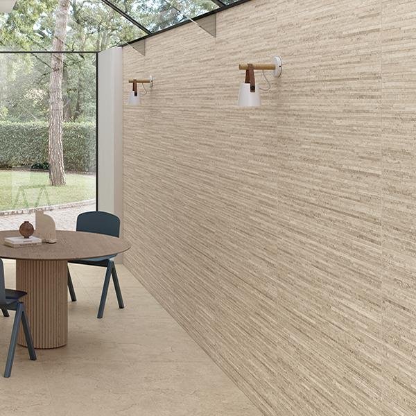 Die Fliesen sind in zwei Haupttypen erhältlich, die von zwei Arten des Steinschnitts inspiriert sind: Cross-cut, für einen Steineffekt, der reich an Besonderheiten und Nuancen ist, und Vein-cut, für einen strengen und eleganten Streifeneffekt.