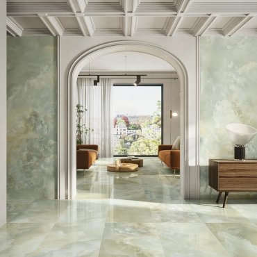 Die neue Kollektion Onice ist Teil der breiten Palette von Keope lapped marbles, einem zarten und völlig modernen Feinsteinzeug mit Marmoreffekt. Onice ist das Ergebnis einer technologischen Innovation, die auf die Innenarchitektur angewandt wurde. Dieser kostbare, widerstandsfähige und leuchtende Marmorstein verleiht den Räumen durch das Spiel des Lichts auf seinen reflektierenden Oberflächen Tiefe.