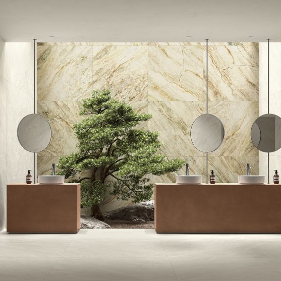 Die Kollektion umfasst zwei Oberflächen, eine natürliche und eine griffige im Format 60x60, ideal für hybride Umgebungen, in denen Wasser vorkommen kann, wie Duschen, Spas und Terrassen.