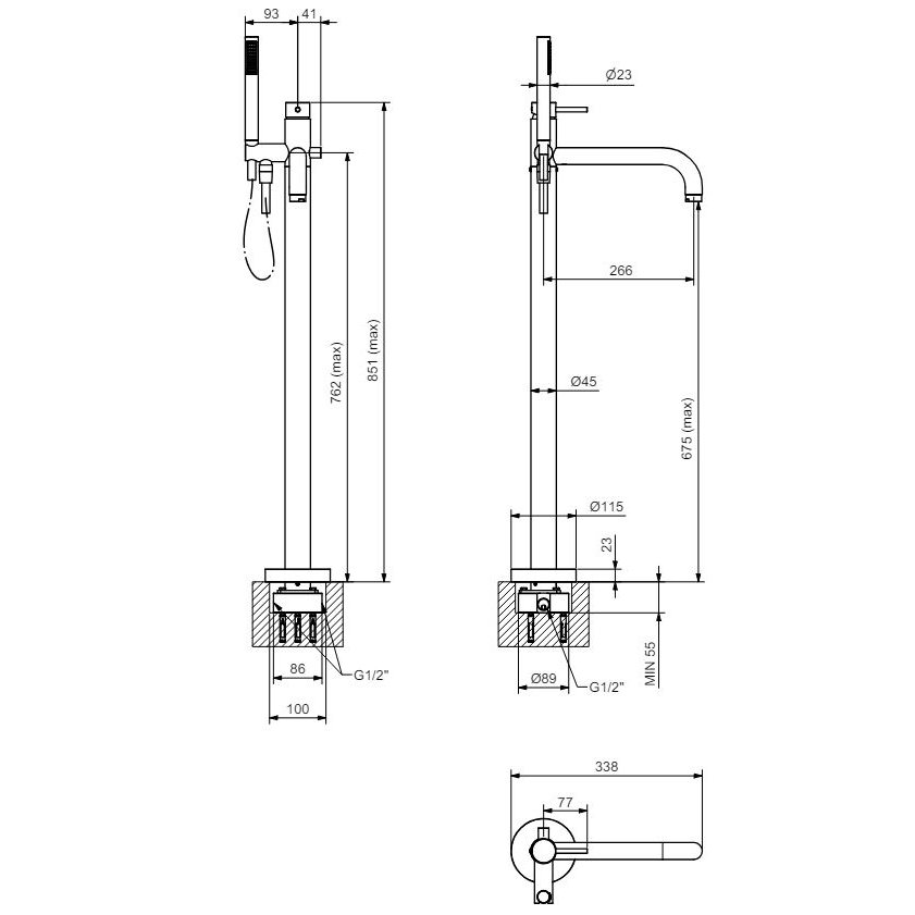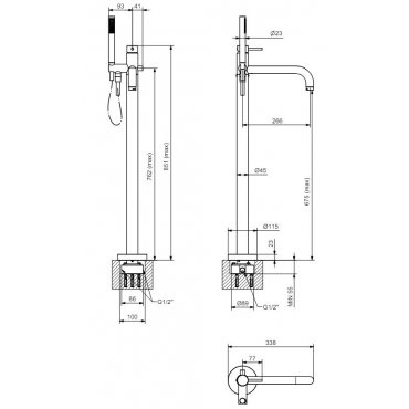 BUGNATESE K-LINE BODENSTEHENDE WANNENBATTERIE, 26CM AUSLAUF UND HANDBRAUSE CHROM