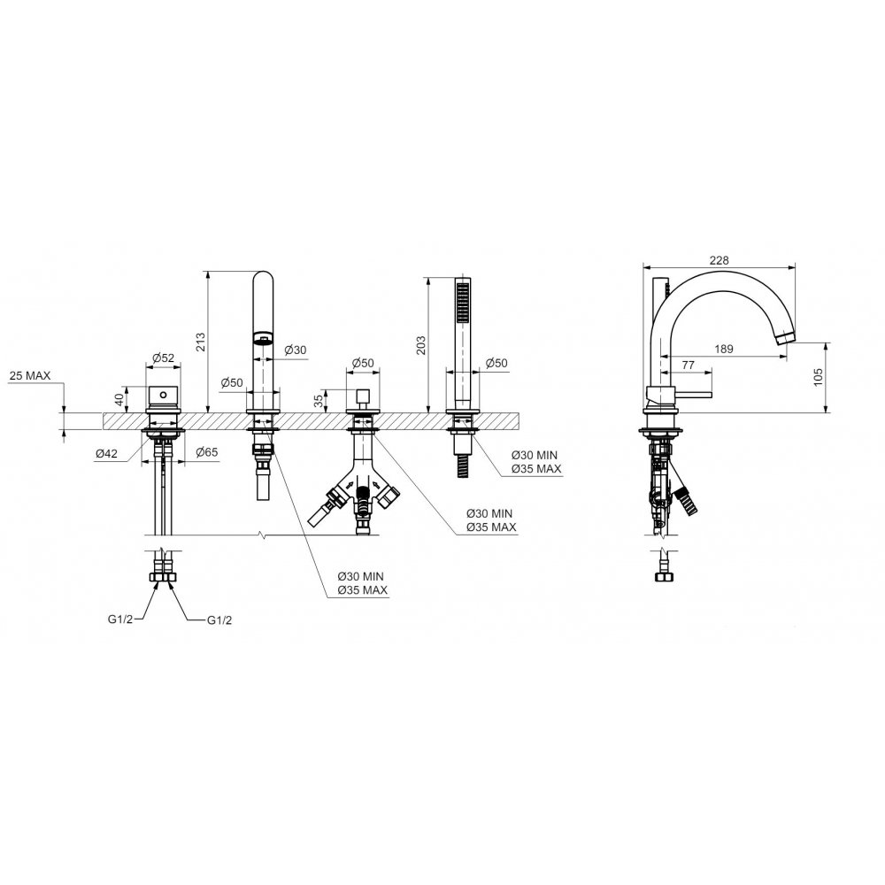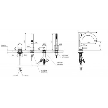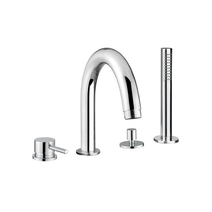 BUGNATESE K-LINE 4-LOCH-WANNENBATTERIE MIT HANDBRAUSE UND AUSLAUF CHROM