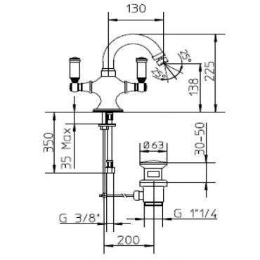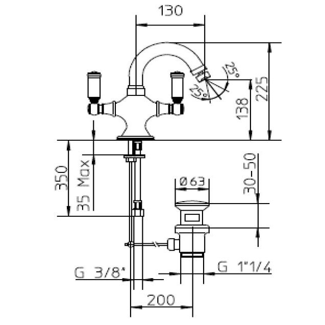 Bidet-Einlochbatterie mit schwenkbarem Auslauf und 1"1/4-Ablaufgarnitur.