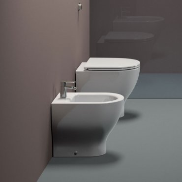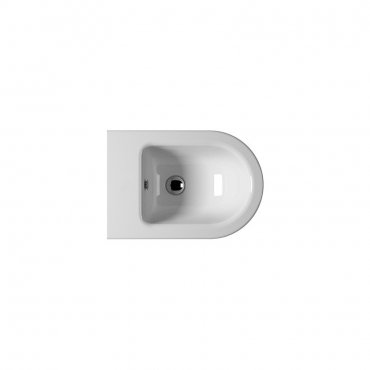 Bodenstehendes, wandbündiges Bidet mit Einlocharmatur und Überlauf.