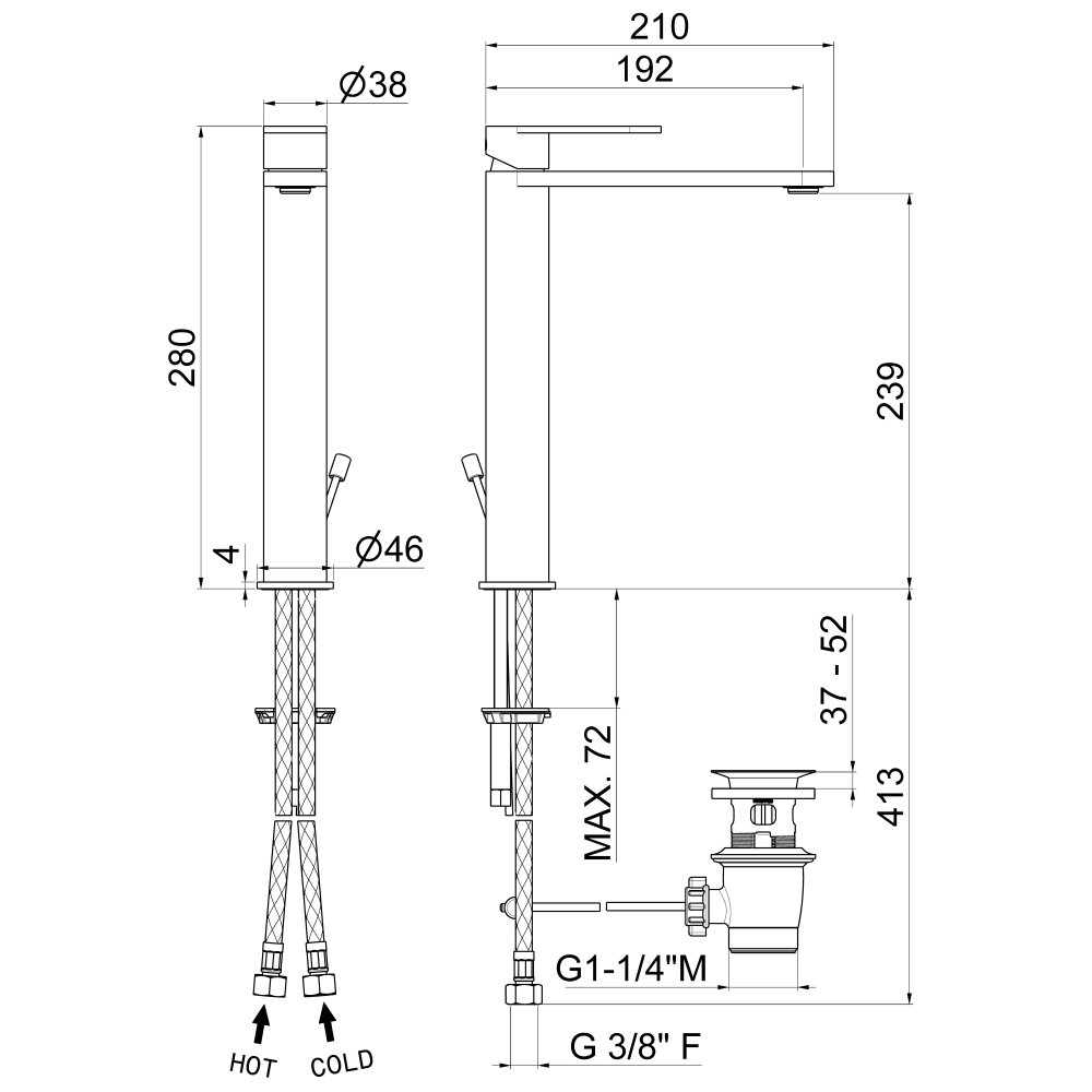 Einhebel-Waschtischmischer in hoher Ausführung, mit 1"1/4-Ablaufgarnitur. F3/8"-Zulaufschlauch.