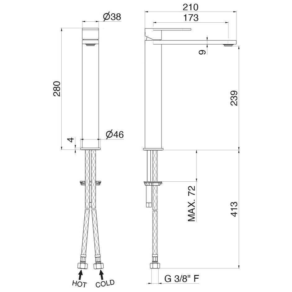Einhebel-Waschtischmischer in hoher Ausführung, ohne Ablaufgarnitur. Zulaufschlauch F3/8“.