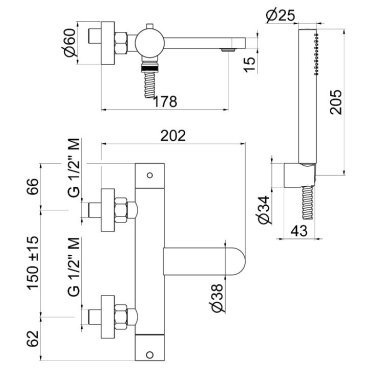 Externe Wannengruppe komplett mit festem Träger, flexiblem Schlauch und Handbrause.