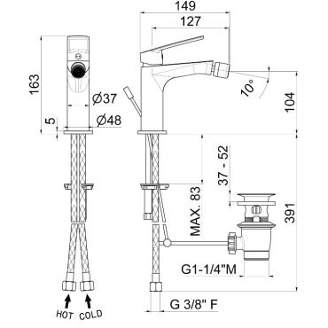 Einhebel-Bidetmischer mit 1"1/4-Ablaufgarnitur.